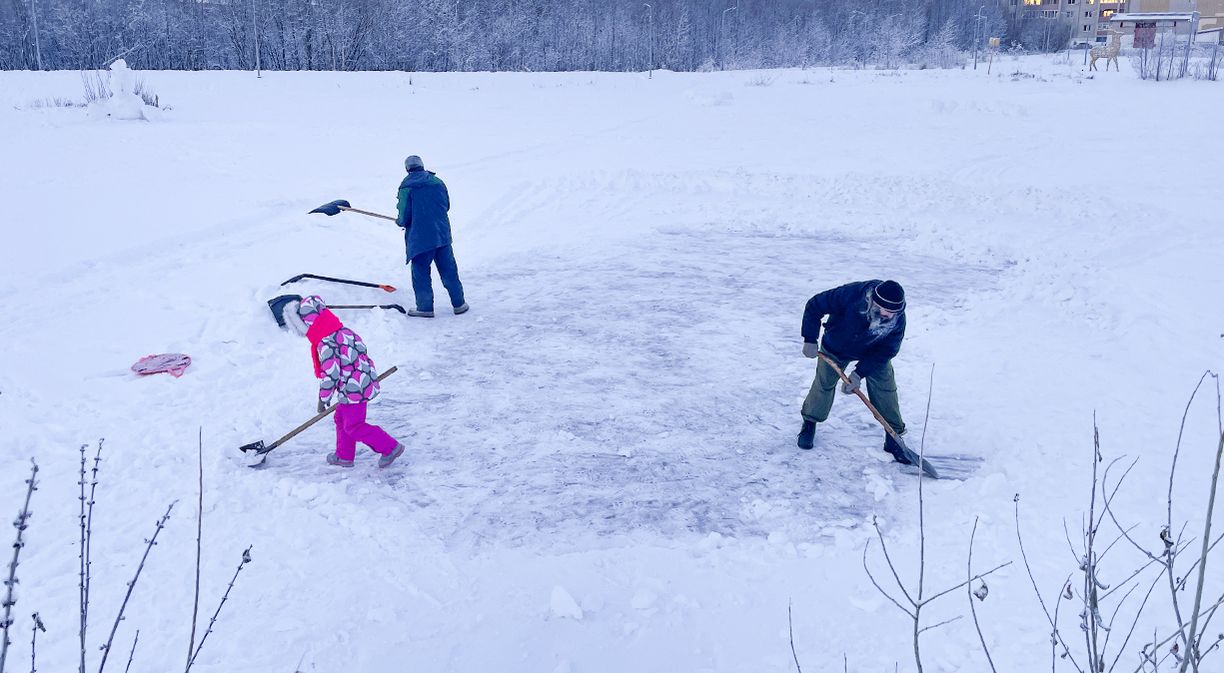 «На озерах и прудах ведь всегда катки делали. Мы просто поздно начали, работы здесь много, потому что слой снега приличный. Хотим расчистить небольшую территорию, чтобы дети могли кататься», – пояснил 50-летний Артем Матьяшек, который пришел на расчистку льда и является одним из инициаторов идеи.