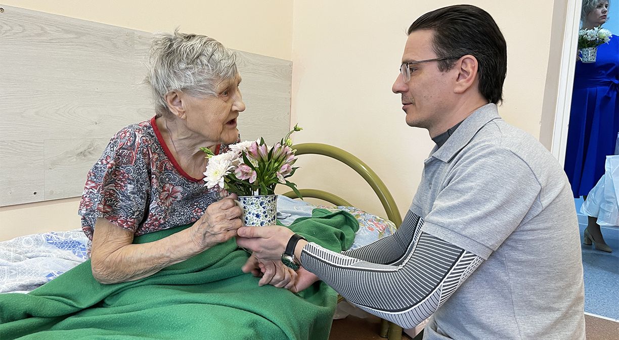 Но не все получатели социальных услуг смогли побывать на праздничном концерте. Добровольцы-спасатели обошли стационарные палаты и лично поздравили тех, кто по состоянию здоровья уже давно не встает с постели.