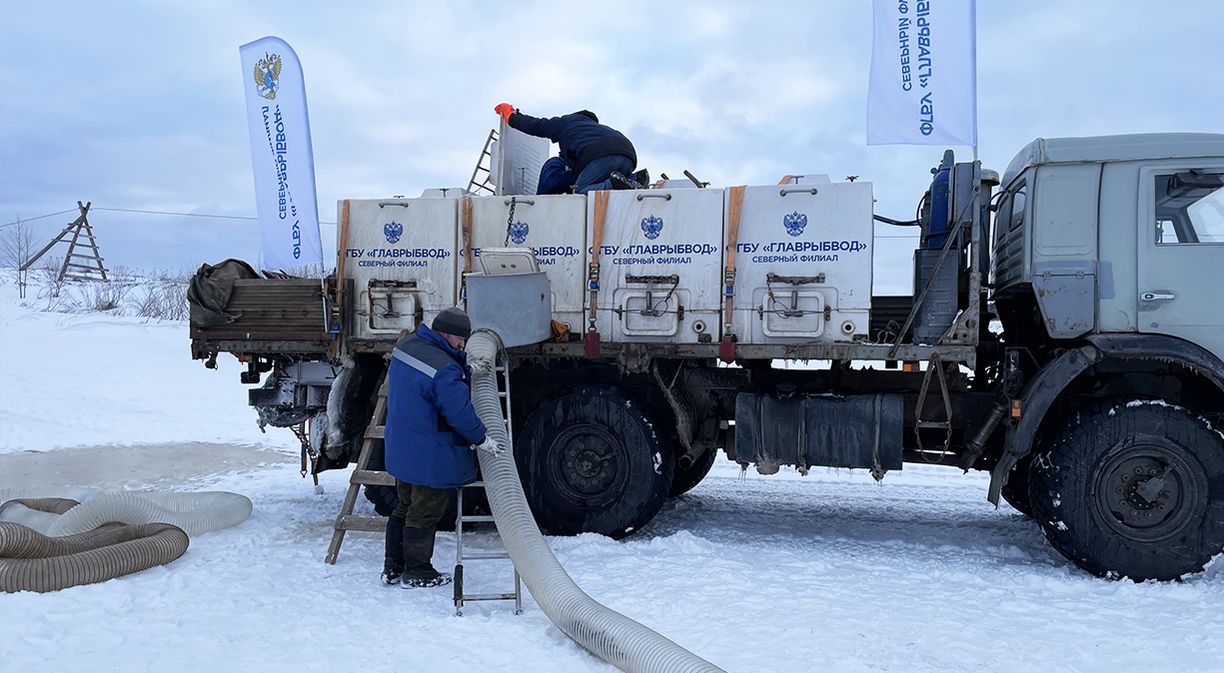 От автомобиля с контейнерами протянули специальный гофрированный шланг. По нему, словно по водной горке, молодь направилась в реку.