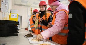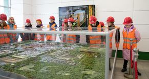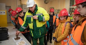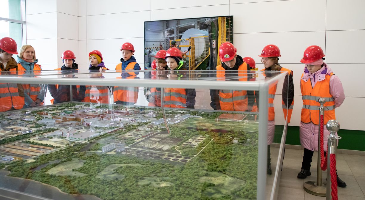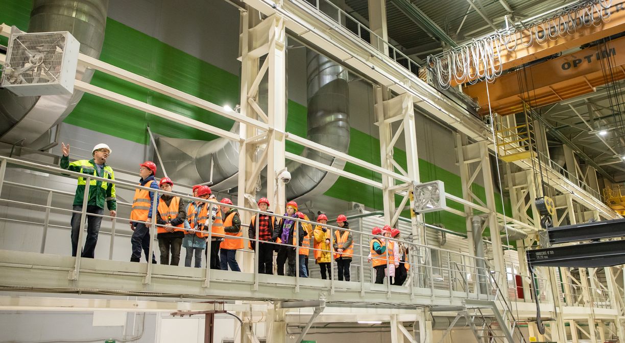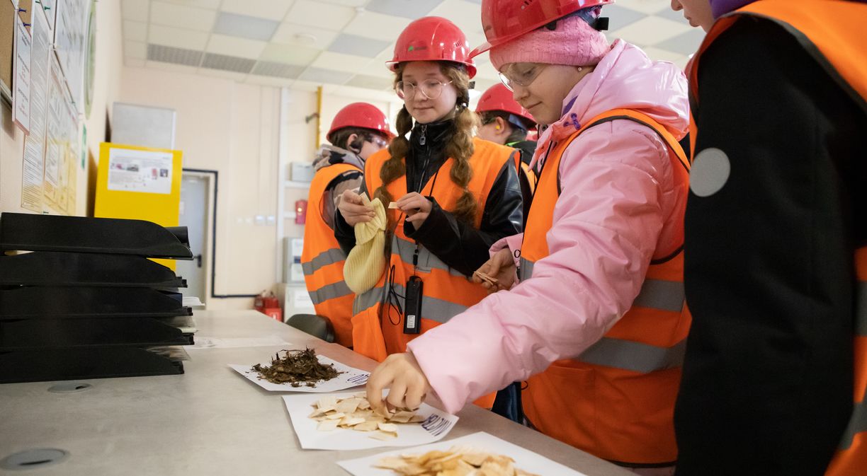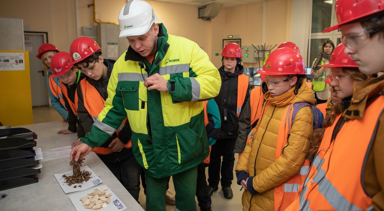 Школьники увидели работу древесно-подготовительного цеха. На пульте управления им рассказали, как построено производство, какие ножи рубят хвойные и лиственничные породы в щепки. В сутки в активный сезон лесозаготовки на комбинат поступает до 480 лесовозов.