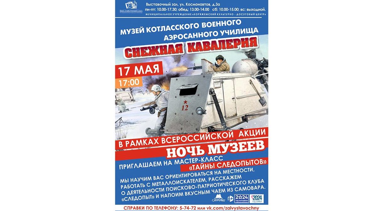 Сегодня, 17 мая, в Коряжме пройдут мероприятия в рамках всероссийской акции «Ночь музеев». В проекте участвуют выставочный зал ККДЦ и музей «Снежная кавалерия». Горожан ждут с 17 до 20 часов по адресу Космонавтов, 3А.