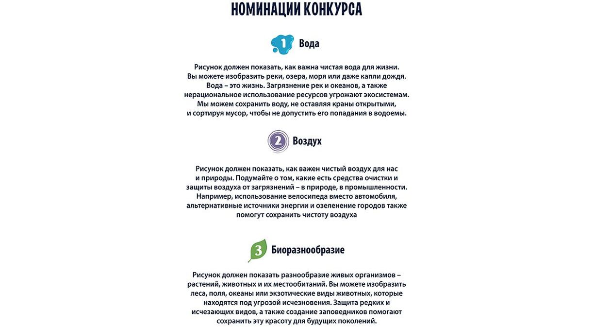 У конкурса три возрастные категории: до 7 лет, 7-12 лет, 13-18 лет. Один участник может прислать до трех работ по одной теме на каждую номинацию – вода, воздух и биоразнообразие. Рисунки могут быть выполнены в любой технике, например, карандашом, гуашью или акварелью. Критериями оценки станут оригинальность, нестандартный подход и творческое исполнение идеи.