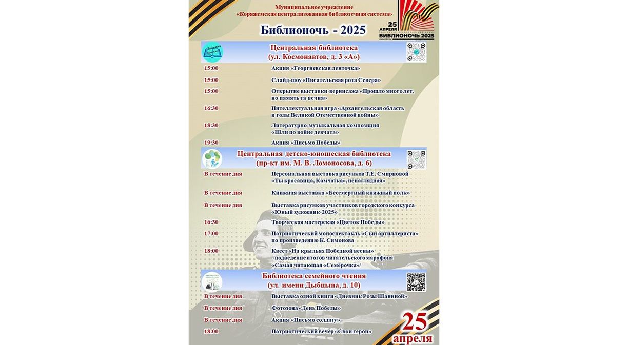 25 апреля горожан ждут в библиотеках Коряжмы: всероссийская акция «Библионочь» в нашем городе пройдет в 13-й раз. Все темы мероприятия посвящены событиям Великой Отечественной войны. Для гостей праздника организаторы приготовили интересную и познавательную программу.