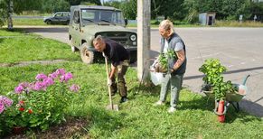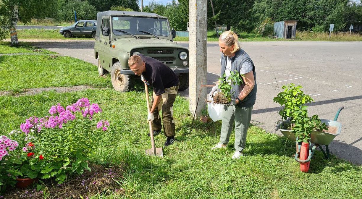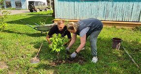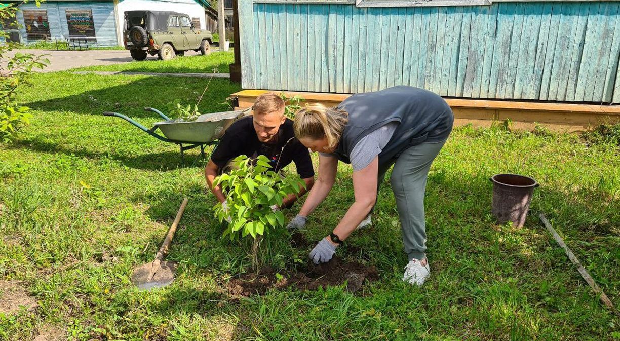 По соседству с храмом, возле местной библиотеки, волонтеры поддержали акцию по озеленению, высадив кусты сирени.