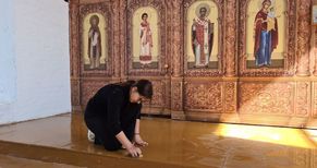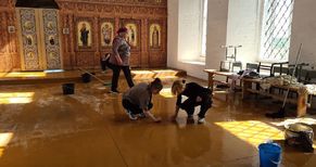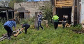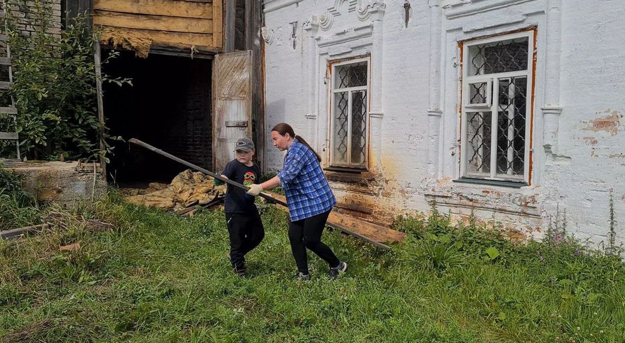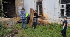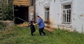 Получив благословение на работы, участники добровольческого кампуса разделились на команды и дружно приступили к делу. В местной кедровой роще волонтеры скосили траву и убрали разросшуюся иву у молодых саженцев. Мужская сила потребовалась рядом с храмом: старый сарай нужно было освободить и демонтировать, а доски погрузить на трактор. Девушки наводили чистоту: отмыли пол на втором этаже, а внешнюю стену церкви, к которой был пристроен сарай, вычистили от древней пыли и прогрунтовали антисептиком.