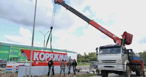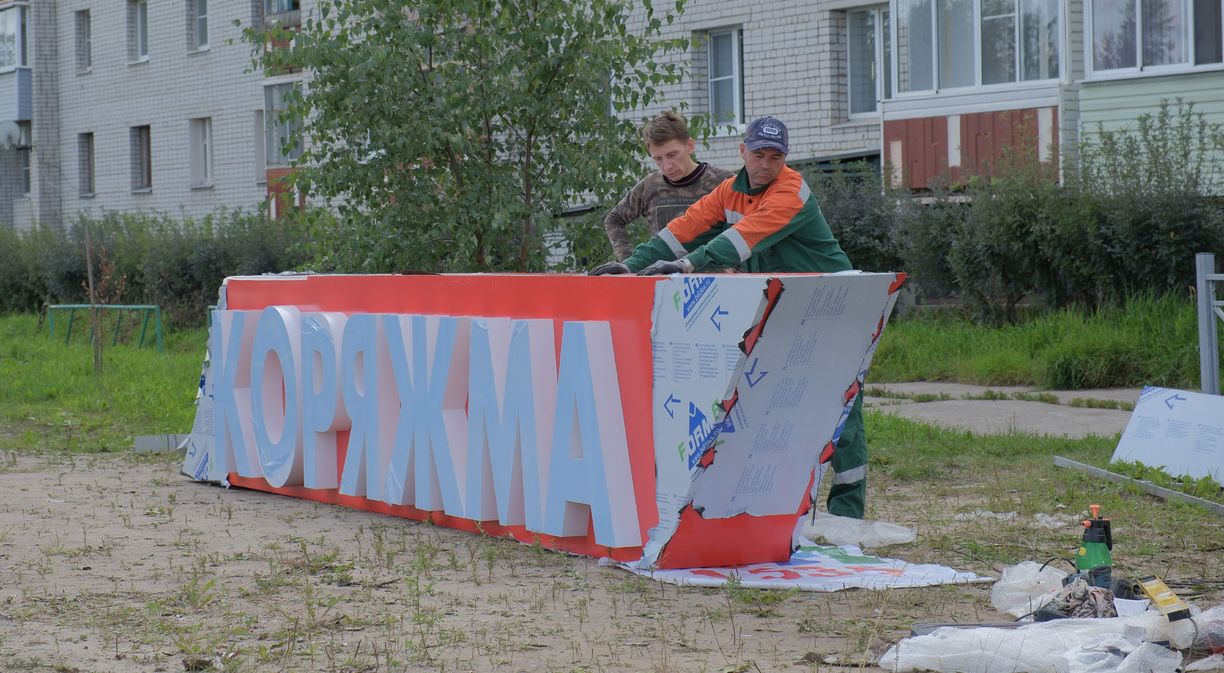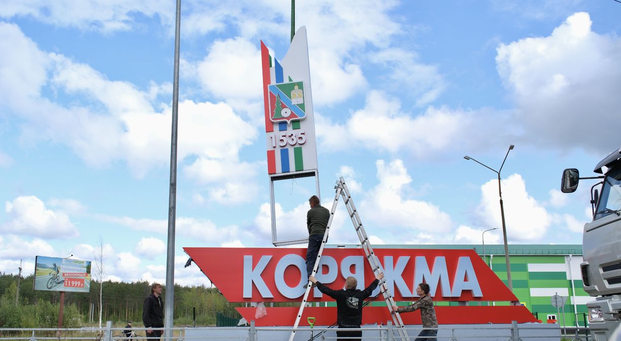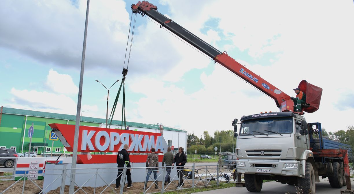 На въезде в Коряжму возле дома на Архангельской, 33 идет монтаж нового арт-объекта. Он состоит из нескольких элементов. Накануне была выполнена заливка основания, сегодня специалисты подрядной организации (ИП Александр Перегородин) заняты обшивкой каркаса, а также установкой остальных элементов – названия города и вертикальной стелы с изображением герба Коряжмы и цифрами «1535», датой основания Николо-Коряжемского монастыря.