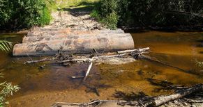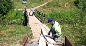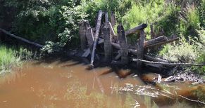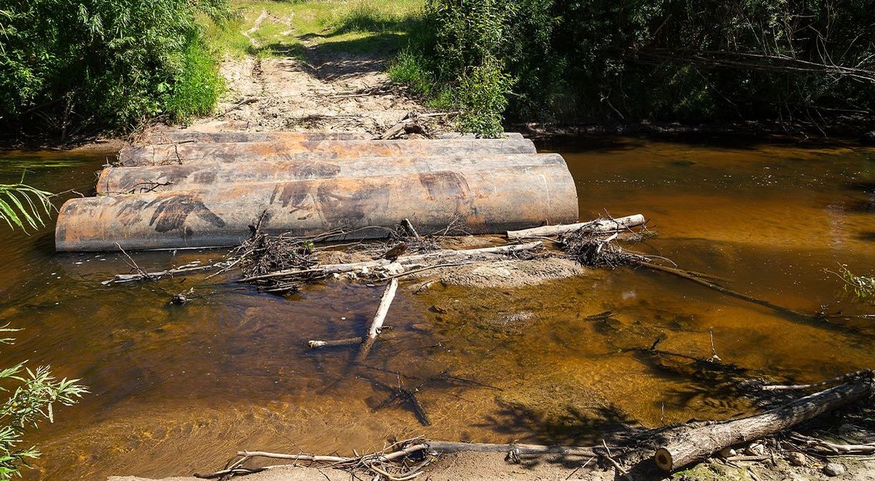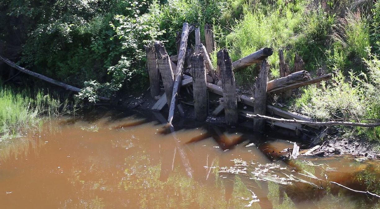 Семь лет назад мост был признан аварийным, но восстановить его до сих пор не удалось. Временный настил из труб был разрушен паводком и быстрым течением реки.