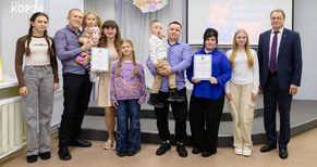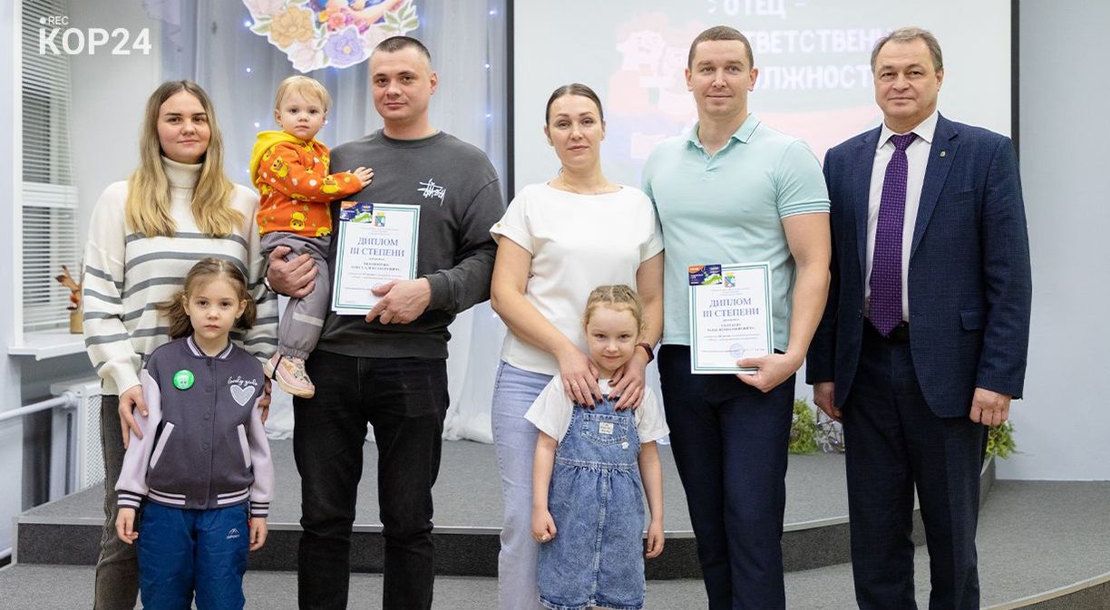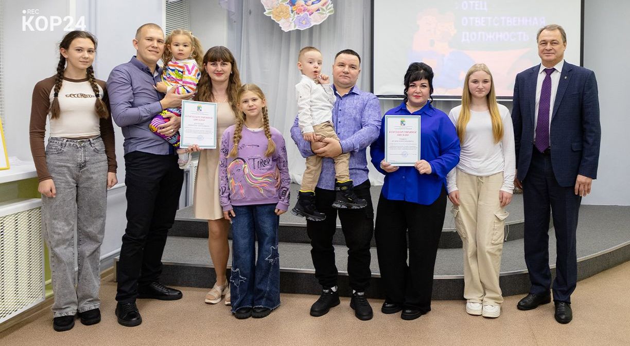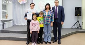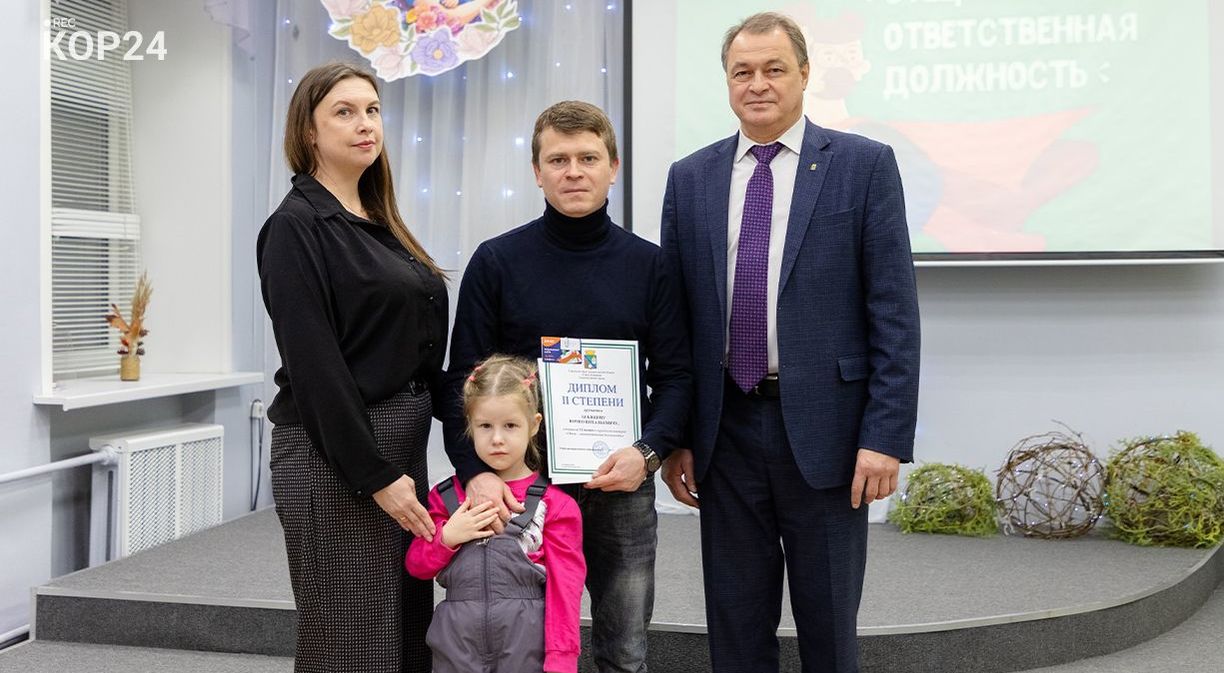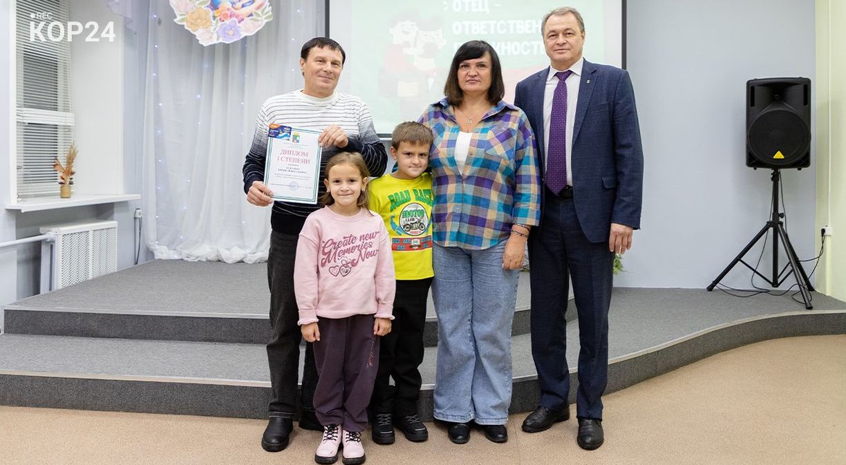 На торжественную церемонию многие родители пришли вместе с детьми, подчеркивая важность и значимость семейных ценностей. На это нацелен и ежегодный конкурс для пап — «Отец — ответственная должность». В 2025-м в нем приняли участие семь коряжемцев. В тройку призеров вошли Илья Голубев и Олег Тихомиров (3-е место), Юрий Бебякин (2-е место), победителем стал Юрий Горулев. Поддержать Юрия Николаевича семья пришла в полном составе — супруга Наталья и двое детей: сын Иван и дочка Машенька.