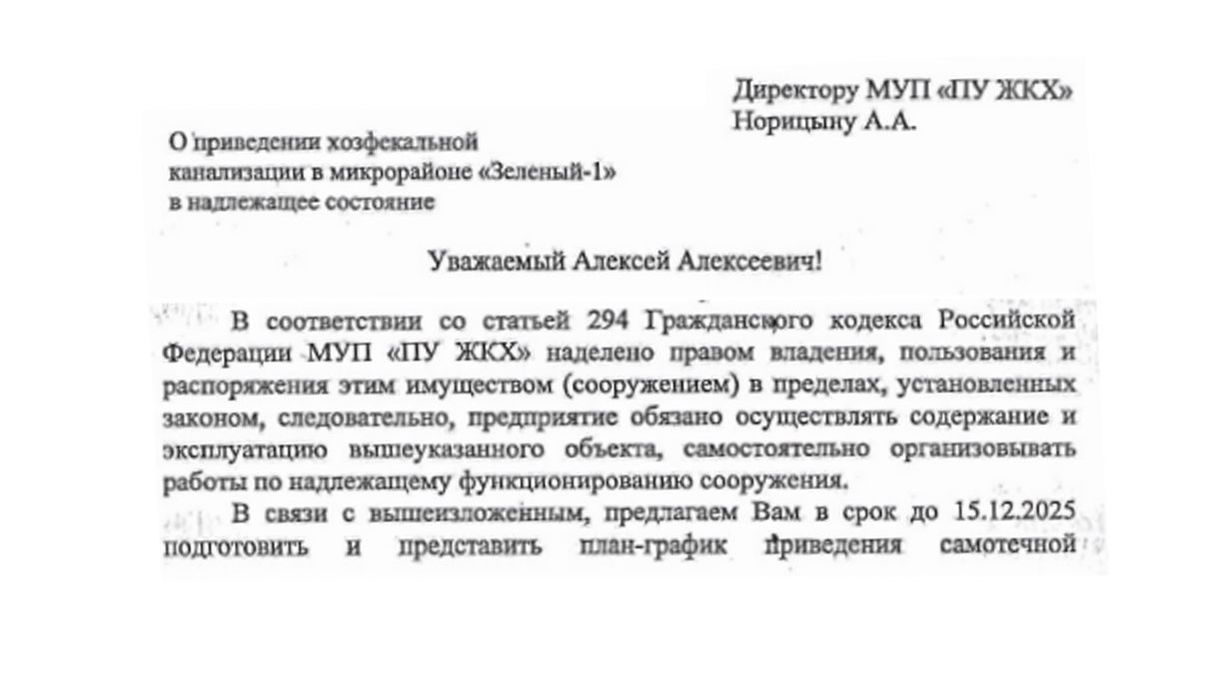 «В связи с вышеизложенным предлагаем вам в срок до 15.12.2025 года подготовить и предоставить план-график приведения самотечной хозфекальной канализации в надлежащее состояние в соответствии с отчетом о выявленных недостатках…»