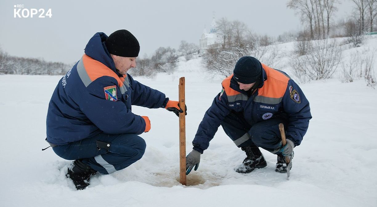 Традиционные обрядовые купания в этот день в нашем городе проходят на реке Большая Коряжемка. Перед установкой купели специалисты службы спасения проверили безопасность места и измерили толщину ледового покрова.