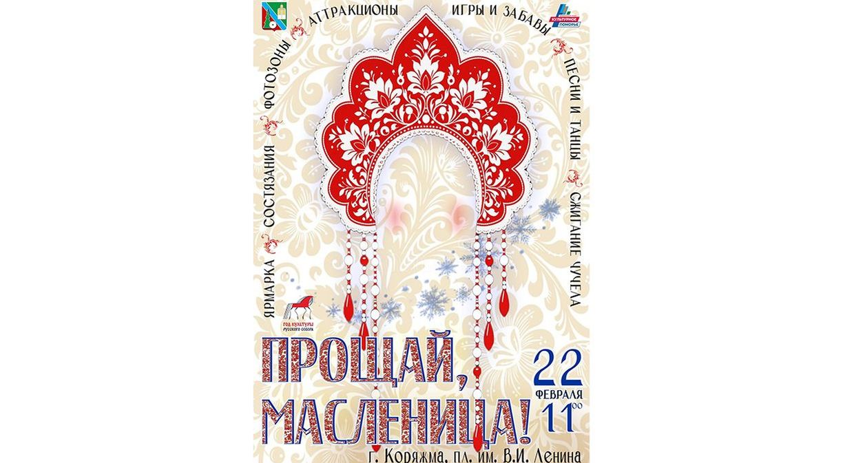 Мероприятия, посвященные Масленице, в Коряжме уже начались. Накануне в Доме детского творчества стартовали игровые программы для школьников, знакомящие с народными традициями и обрядами. В учреждениях культуры пройдут фольклорные викторины, выставки, экскурсии, мастер-классы… Завершится блинная неделя общегородским праздником «Прощай, Масленица!» Он пройдет на главной площади Коряжмы в воскресенье, 22 февраля.