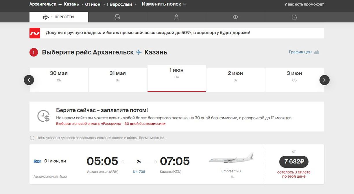 С 1 июня из областного центра запустят прямой авиарейс в столицу Татарстана. Полёты два раза в неделю — по понедельникам и четвергам — выполнит компания Nordwind Airlines совместно с «Икар» на лайнерах Embraer 190 (110 посадочных мест). Билеты уже в продаже, цена — от 10 тысяч рублей в одну сторону.