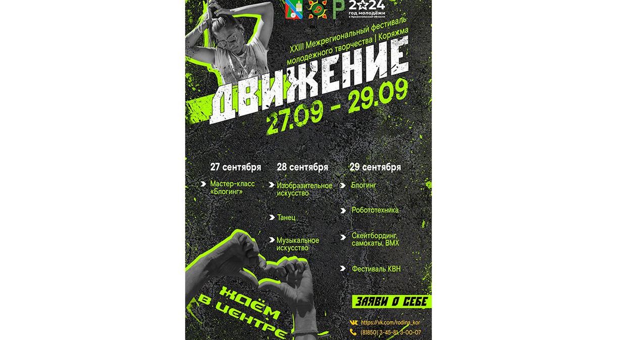 Начался прием заявок на участие в XXII межрегиональном фестивале молодежного творчества «Движение». Он пройдет в Коряжме с 27 по 29 сентября, организаторами выступают администрация города и молодежно-культурный центр «Родина».