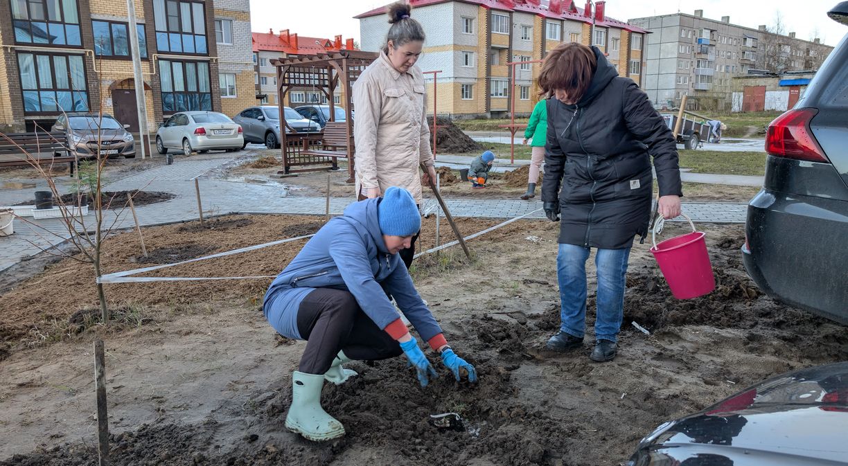 В микрорайоне «Радуга» оживление: начался очередной этап проекта «Зеленый двор», который получил на реализацию порядка 1 млн рублей из областного и местного бюджетов в рамках региональной программы «Комфортное Поморье».