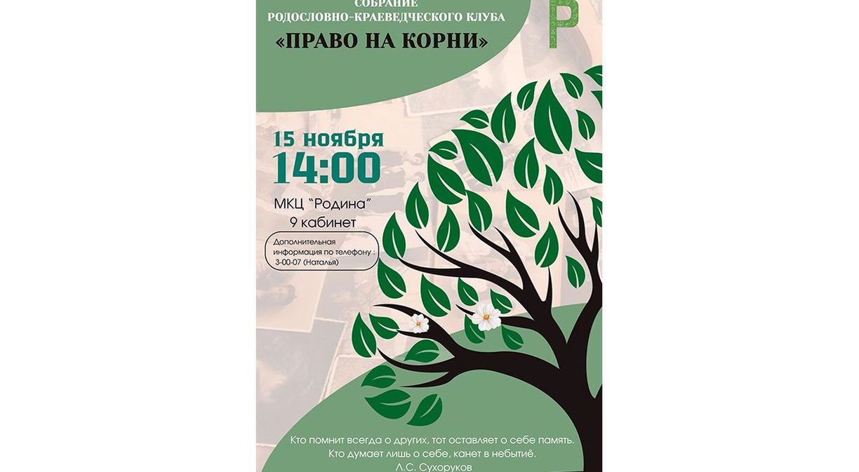 15 ноября в молодёжно-культурном центре «Родина» ждут всех, кто желает научиться воссоздавать свое родословное древо. Очередная встреча участников родословно-краеведческого объединения «Право на корни» пройдет в субботу с 14 часов.