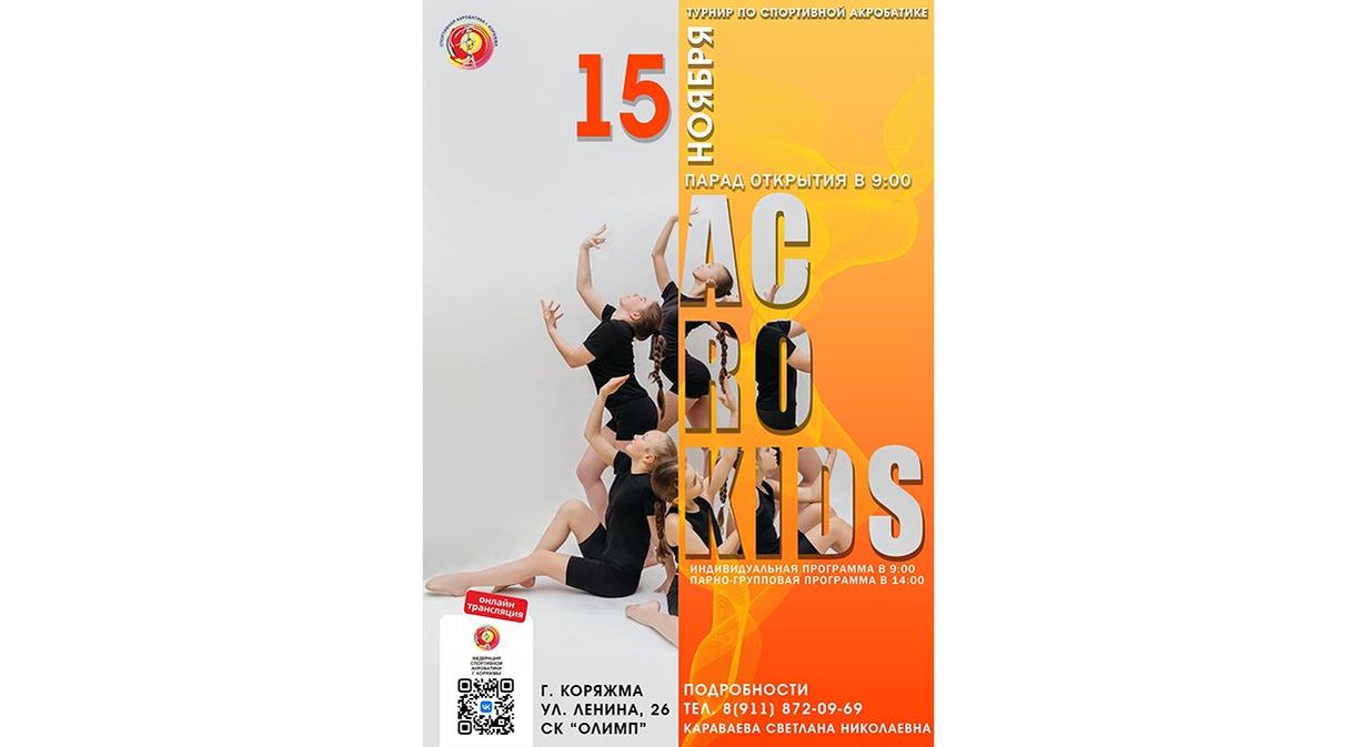 Начнется суббота ярко и энергично. В спорткомплексе «Олимп» состоится межрегиональный турнир по спортивной акробатике «Акрокидс». С 9:30 начнутся соревнования в индивидуальной программе. С 14 часов – в парно-групповой. За победу будут бороться более 130 спортсменов в возрасте от 3 до 17 лет. Конкуренцию коряжемским и котласским акробатам составят гости из Великого Устюга и Северодвинска.