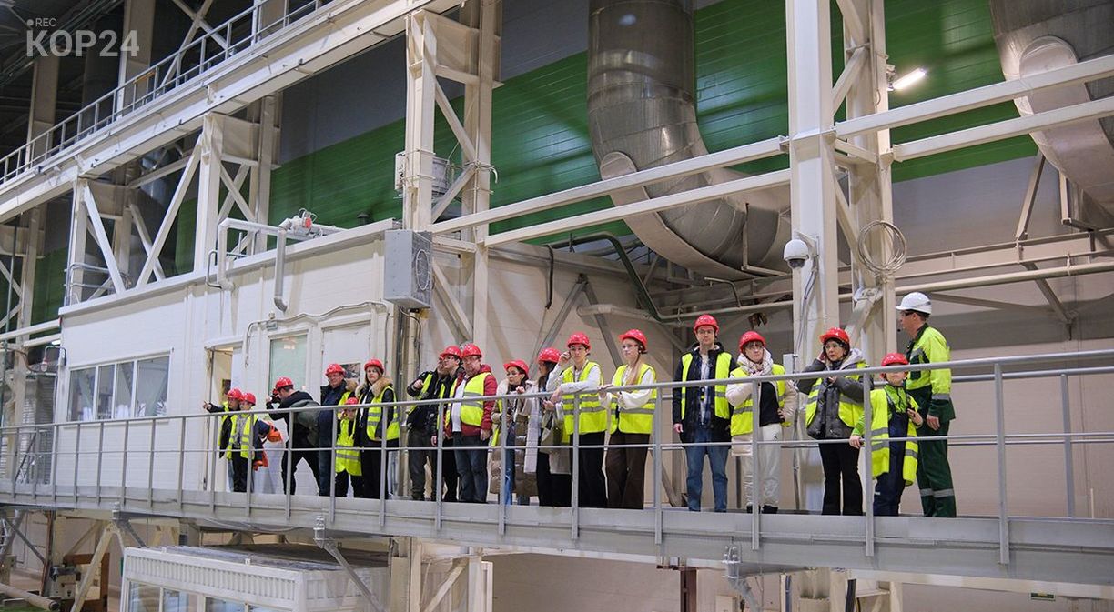 Знакомство с современными страницами истории комбината продолжилось в здании заводоуправлении у макета предприятия, где отражены основные объекты промплощадки. А сразу после гостей пригласили на обзорную экскурсию. На комфортабельном автобусе они проехали по территории комбината, увидели, где разгружаются лесовозы, посетили древесно-подготовительный цех и производство офисной и офсетной бумаги.